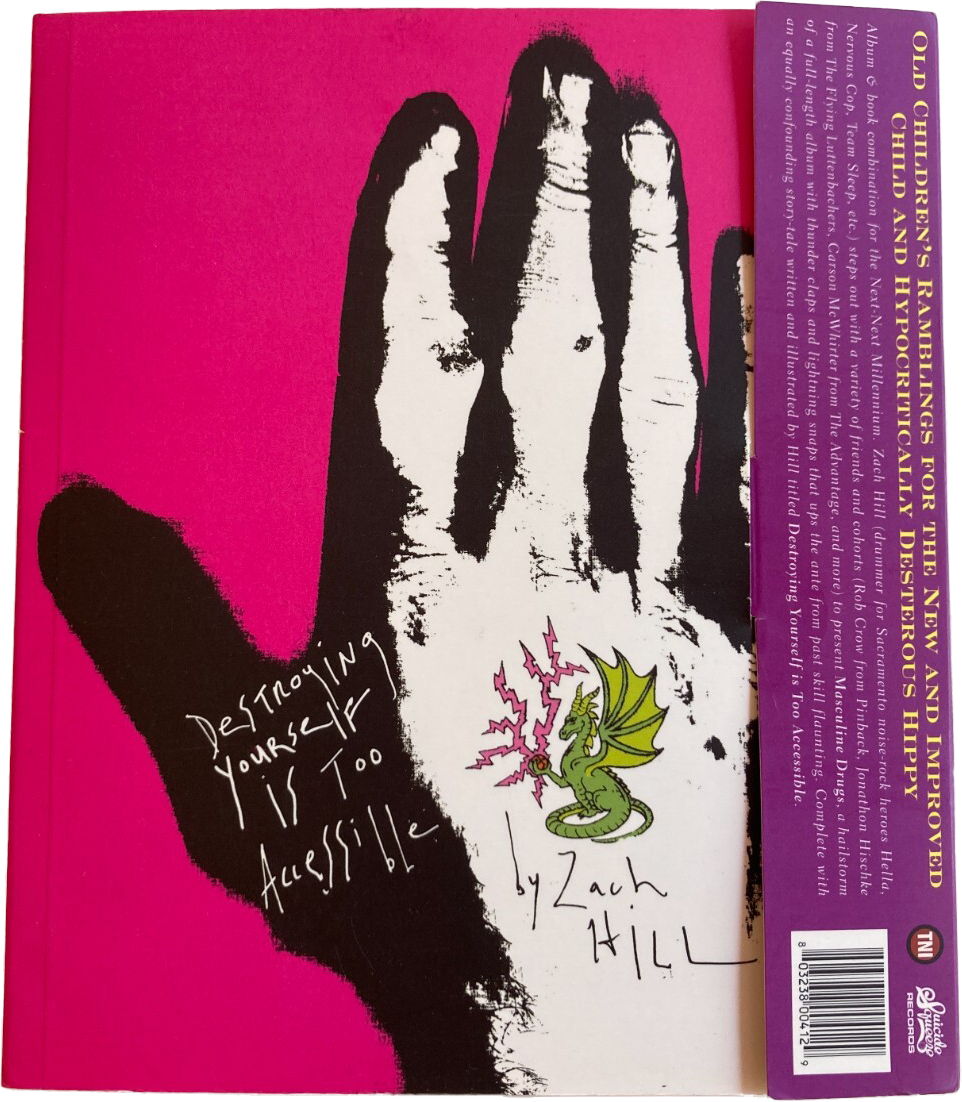 While booking Hella, I was also publishing underground books, and those worlds overlapped now and then. Teaming up with David and Suicide Squeeze, we co-published an inscrutable book written and illustrated by Zach Hill called Destroying Yourself is Too Accessible. It came packaged with an album called Masculine Drugs from his side-project Holy Smokes. It’s very rare.