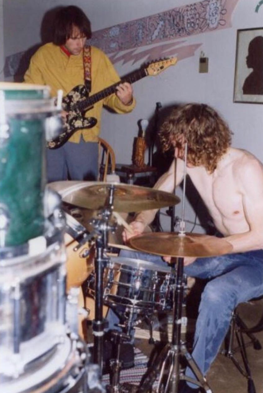 Another duo, Lightning Bolt, were kings of the Rhode Island warehouse scene, and it was easy to see Hella as the California counterpart. Lightning Bolt lore, backed up by grainy video in a documentary, said the mayhem of their shows caused spontaneous make-outs among their fans. Hella shows were not sexualized, but I often saw people laughing while they played, but not because the band was funny. Their hard-to-solve equation of time signatures and changes, the preternatural tapping of Spencer’s guitar, and the athleticism of Zach’s hectic drumming are legitimately confounding. Trying to dance to a momentarily sensical riff or fleeting rhythm only made one look silly. And so fans laughed.