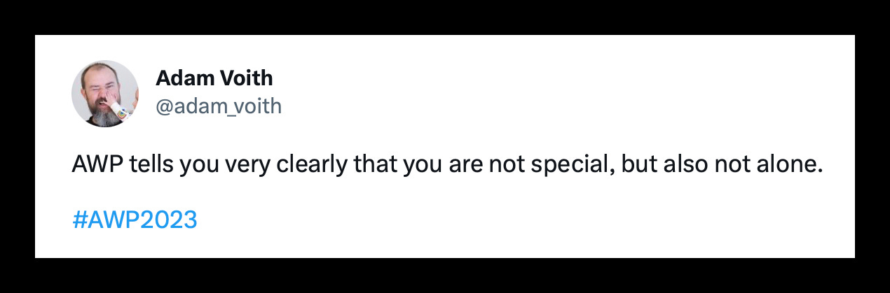 Ok. AWP. Shit, I’ve barely mentioned it. I heard a lot of snark leading up to this thing, but the post-conference consensus in my little world seems to be: That was pretty great!