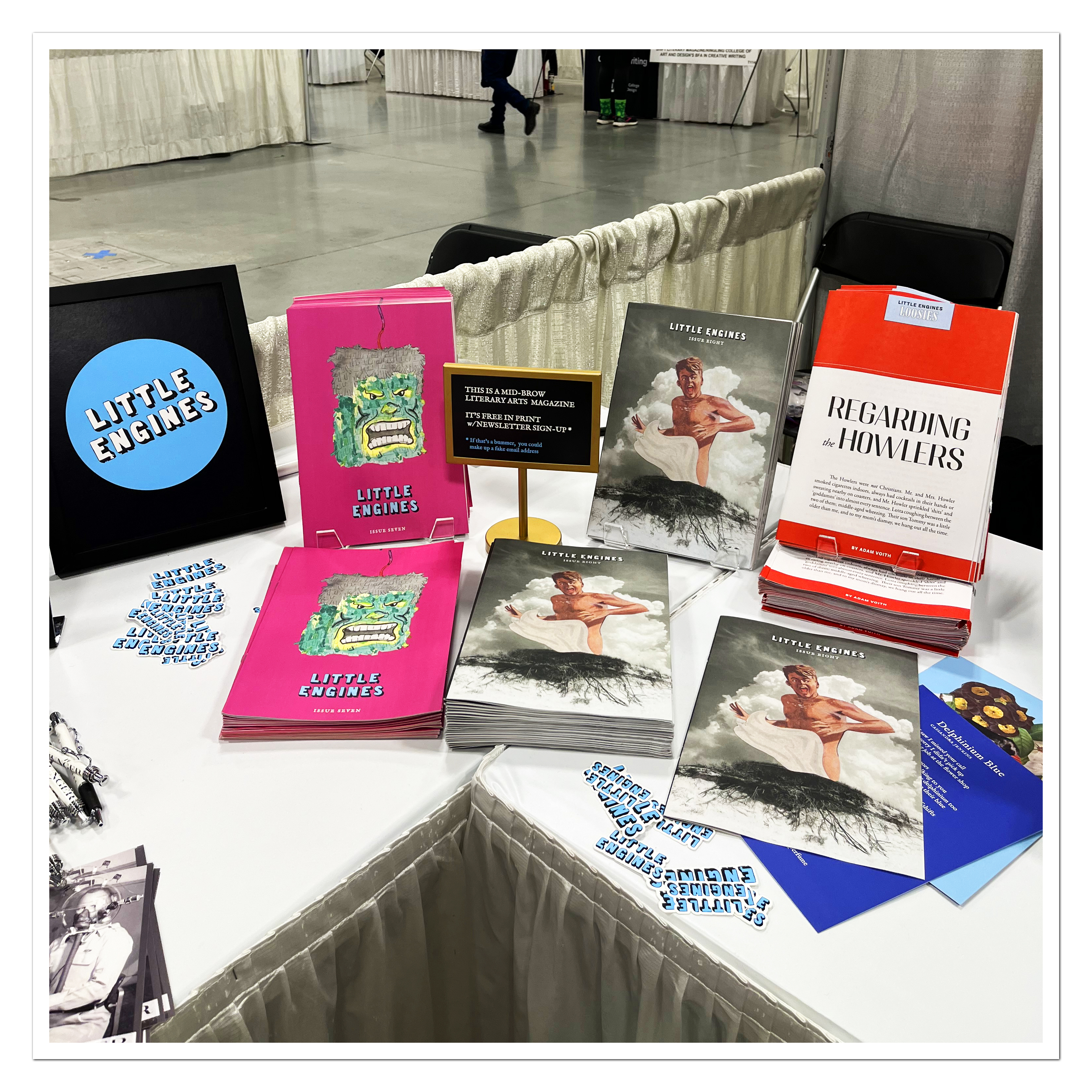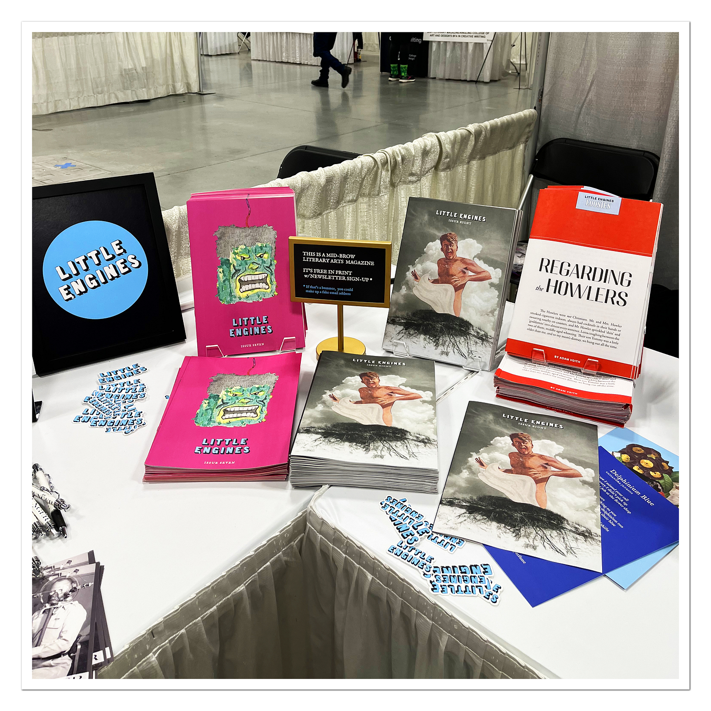 I told myself I was going in knowing nobody, but was pleased to be mistaken: I had a meal with Molly McGhee who’s spreading the word about her debut, coming soon; I briefly bumped into my old friend and novelist Tobias Carroll, who was in early Little Engines issues and wrote a blog on the website in the early days; Joey Sweeney, frontman for a band who were unlucky enough to be the guinea pig for the first tour I booked, was there with his wife who’s crushing in her new role running a poetry journal; Caleb Curtis, who lobbied to publish the first new writing I’d put out there in a very long time, told me the wildest cult story I’ve heard in a minute, a story built around an image so strong and stunning that if he doesn’t write it down soon I’m going to steal it for myself; David Drury, another early Little Engines contributor who has continued to publish stuff in many journals over the last 20 years, and who remains one of the most notorious professional blackjack card counters in the country; and Kevin Sampsell, who did the collage art for the new issue of Little Engines, and stocked the original version of the mag at Powell’s in the early aughts, the second bookstore to carry it, beat to the punch only by Quimby’s in Chicago.