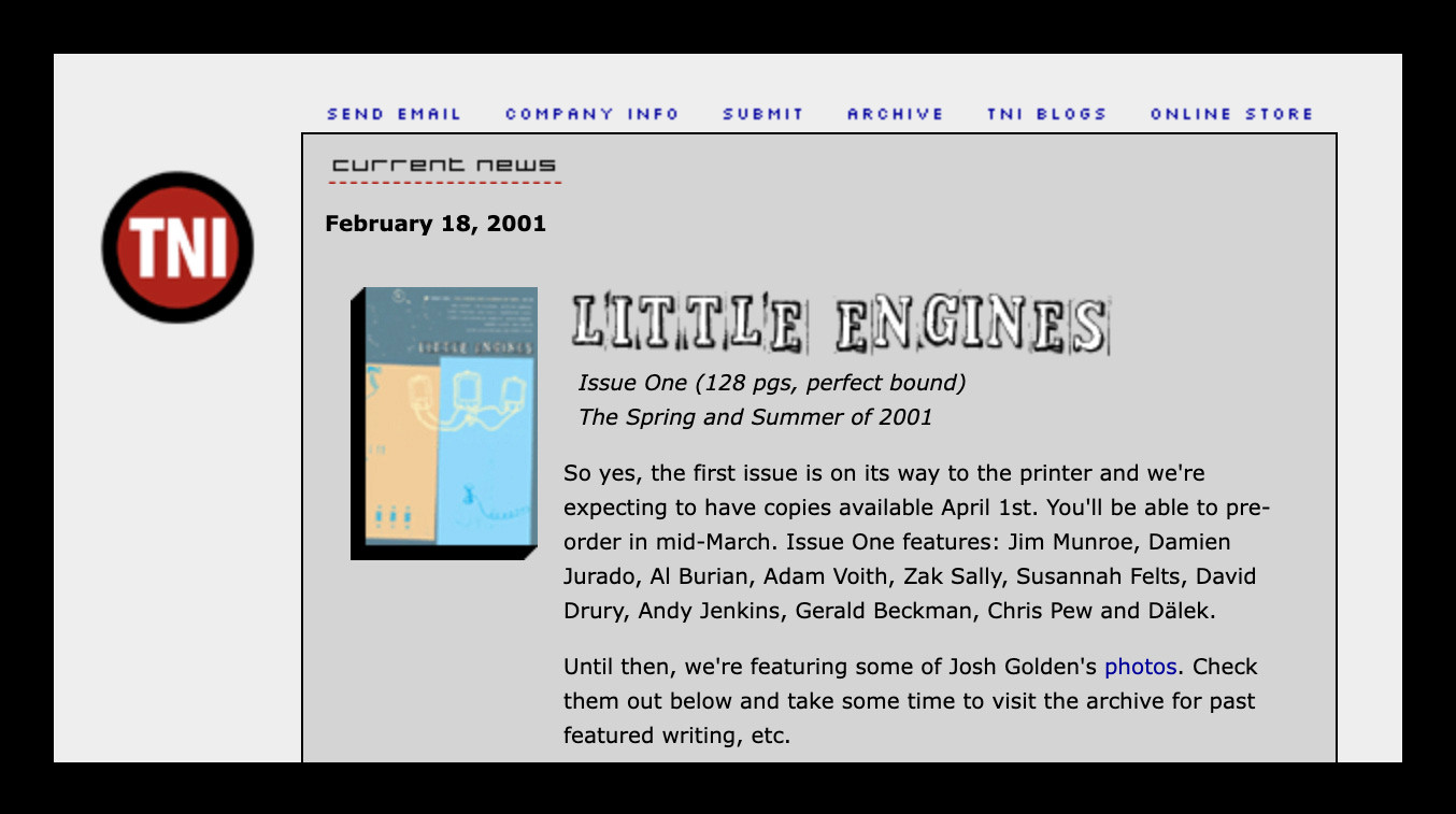 Little Engines first published in Seattle from 2001-2003. The four original issues came via my now long-shuttered small press, TNI Books. It was specifically a Seattle publishing company, and a Seattle magazine. I was losing my mind on memory lane today crawling through the old TNI Books website around the first issue’s release.