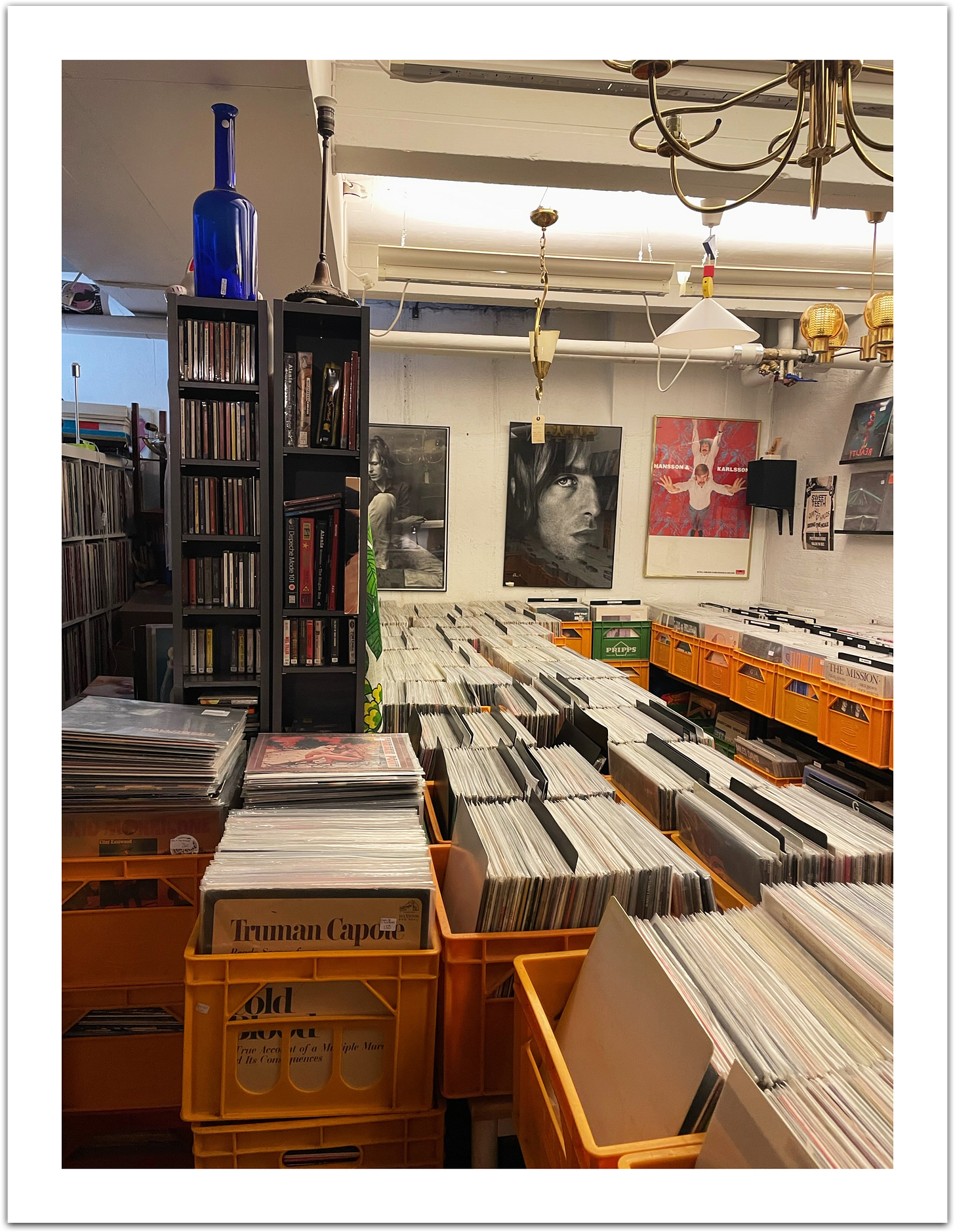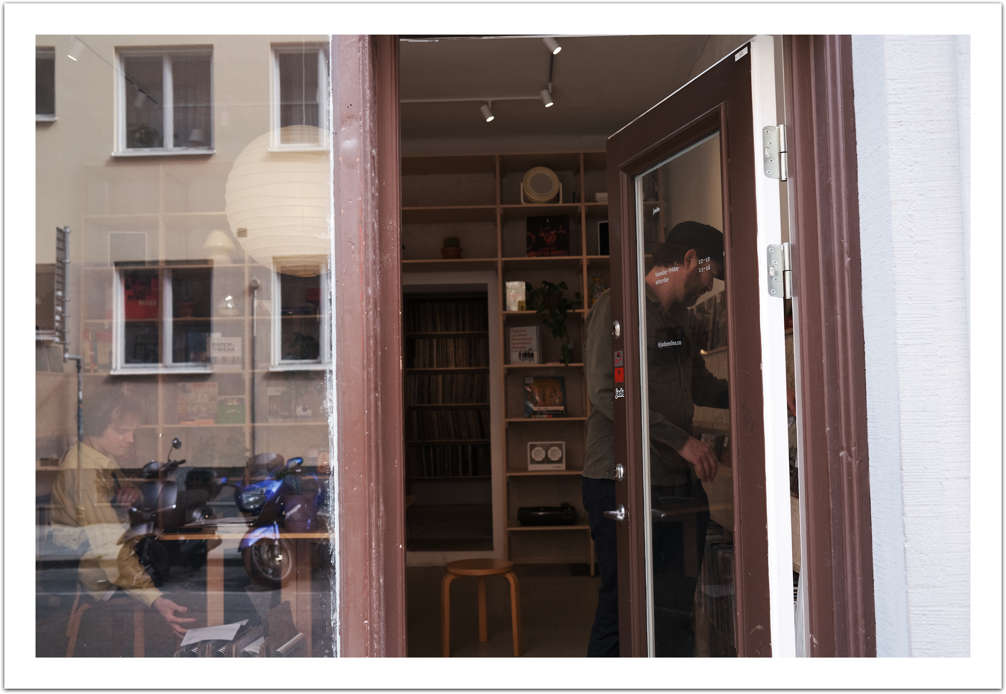 Then this other guy’s sterile store. He’s in the pic below, sitting at a table behind the window of his shop with headphones on, probably grading an LP to be listed later for sale online.