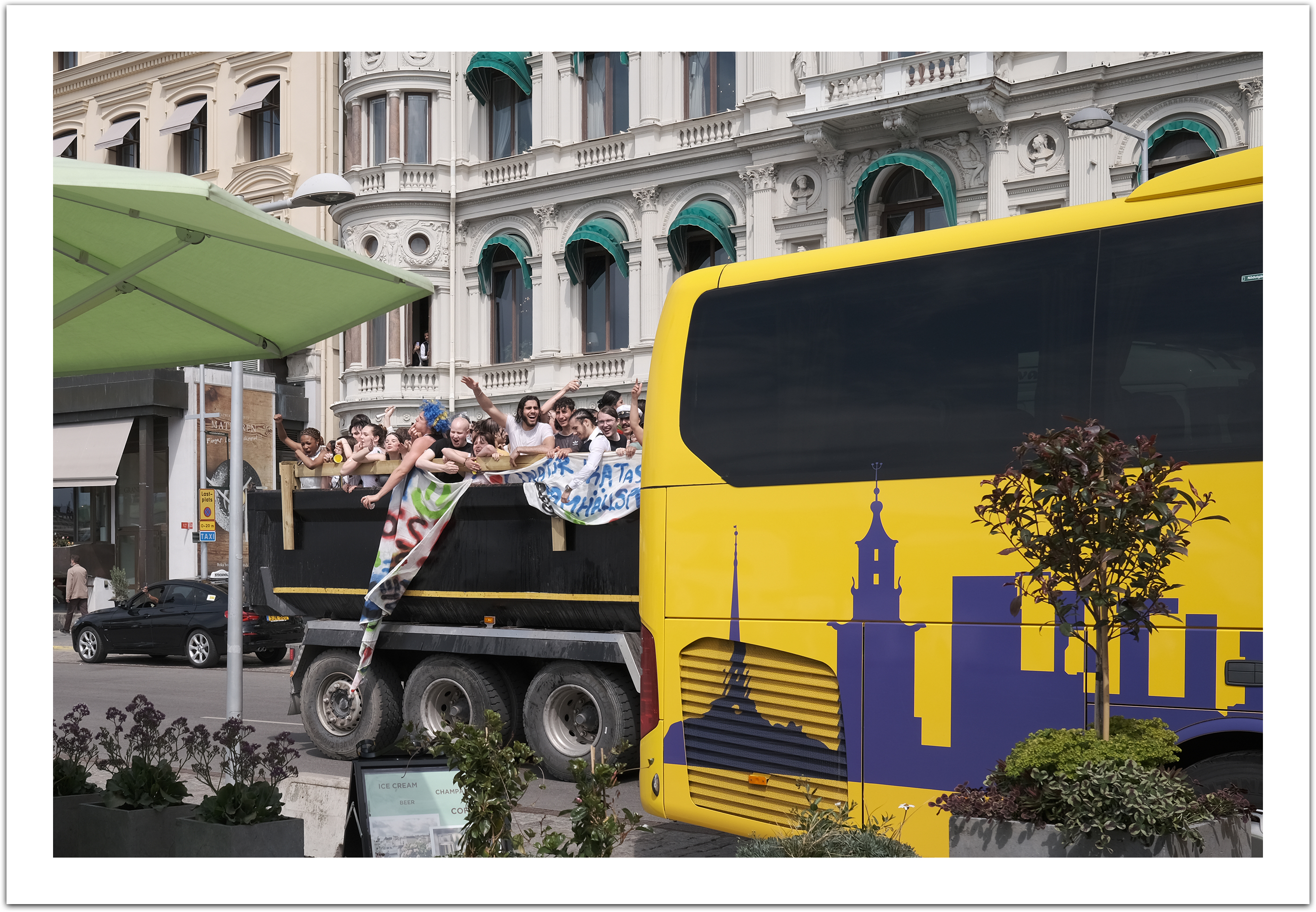 While lingering outside the hotel, waiting for Brian and taking pictures, I heard hoopla and cheering across the water. I saw what looked to be another parade snaking along the waterfront road. This time instead of classy carriages and horses, it was a caravan of three European semis hauling loads of young people with banners, flags, and navel hats. Behind the caravan, a few cars packed with kids followed, blowing their horns. A girl, parade marshall, leaned out the back window of a white sedan huffing into a silver whistle on a rope.