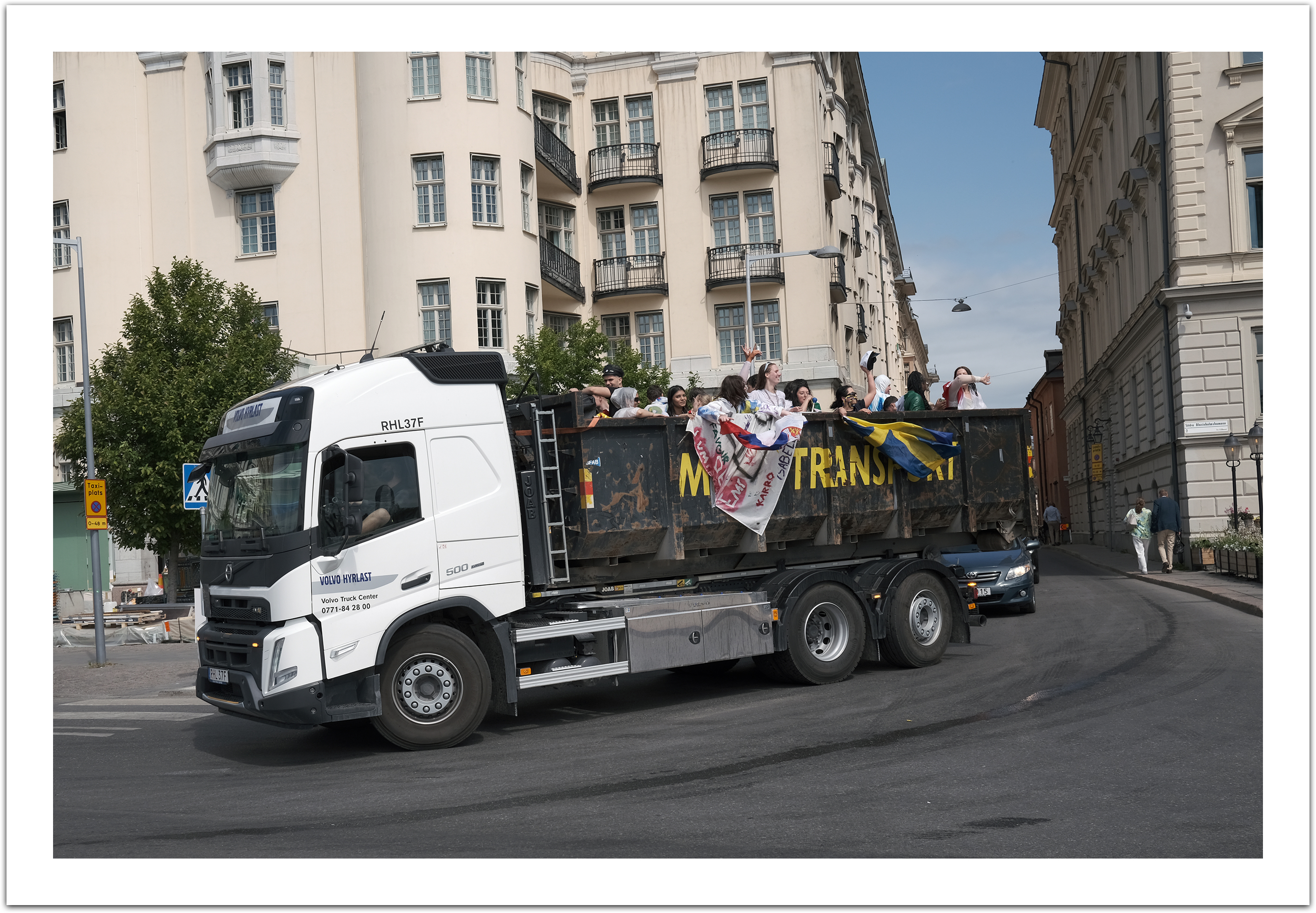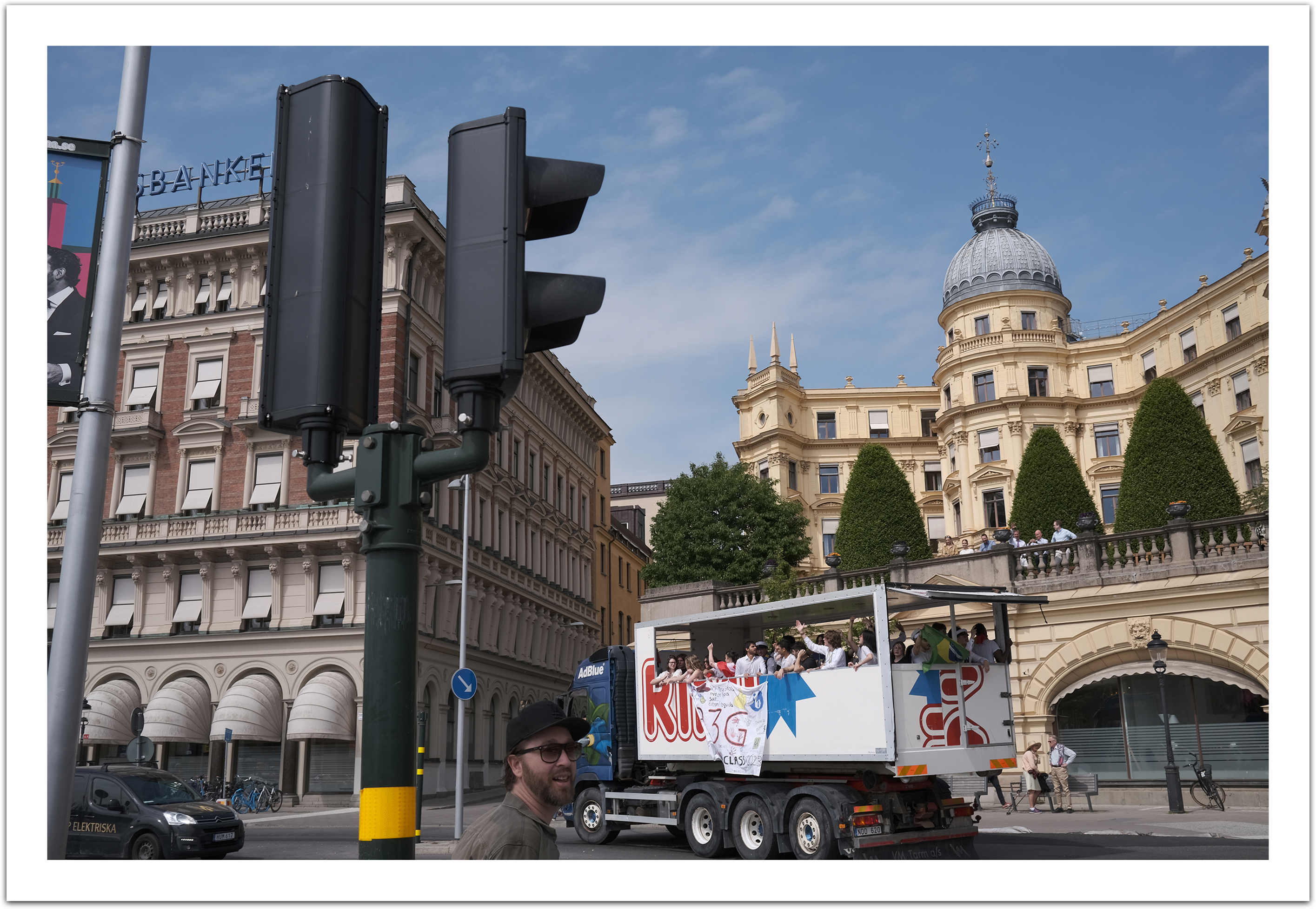 They passed and turned down the road away from the hotel, and eventuallly Brian popped out from the lobby. “Damn, you might have missed the best thing to see in Stockholm,” I said. “It’s graduation week, and the kids are out raging on the backs of trucks.” But then, I heard the whistle and the music and the cheering again. “Oh dude, they’re coming back around. It’s the greatest. Wait until you see this.” Brian watching them go by, smiling, but notably less psyched than me.